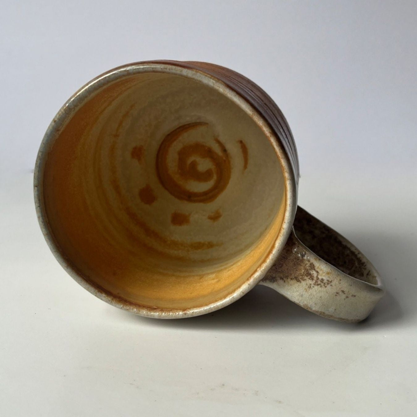 This wood-fired mug was left unglazed prior to loading in the kiln. In wood firing, ash carried by the flame settles onto the clay surface and bonds with it, creating natural glaze, texture, and colour that reveal the flame’s path. Softwoods burn hotter, while hardwoods contain more minerals and produce more ash.